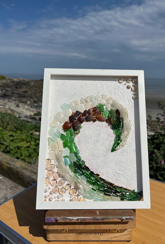 This unique artwork, titled “Sea Wave”, is created from carefully selected pieces of natural sea glass in shades of green, brown, and clear tones, arranged to capture the beauty and motion of an ocean wave. The background is textured and painted white, adding depth and contrast to the composition.
