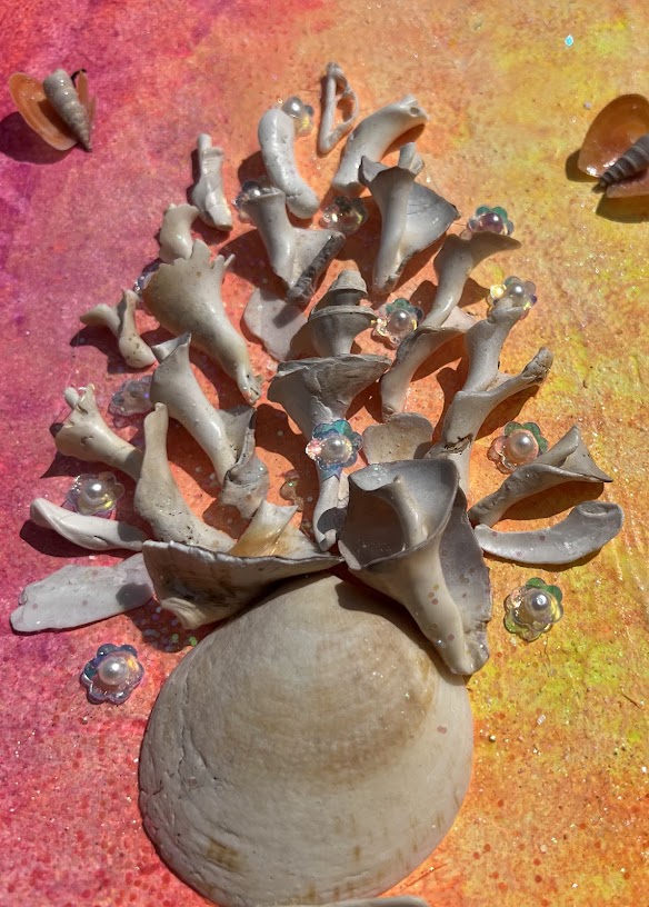 This original piece is crafted from natural seashells arranged to form a beautiful composition. The background is hand-painted with vibrant acrylic colors in warm sunset tones. The artwork is framed in a wooden frame (27.5 x 22.5 cm) and can be displayed both on a table or hung on the wall.